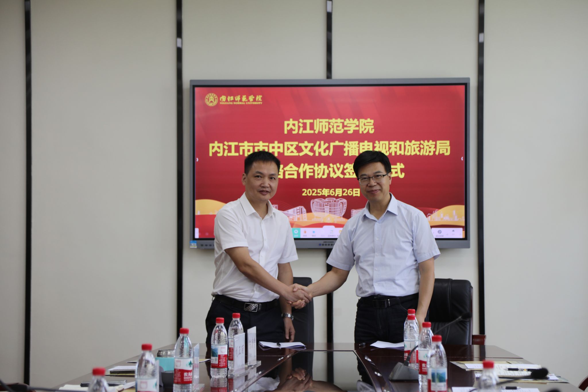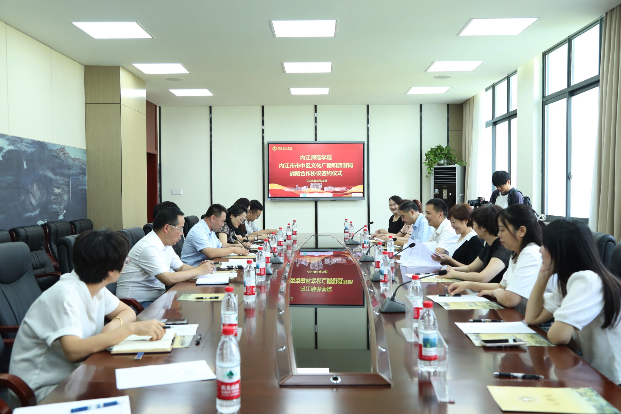 6月26日,我校与内江市市中区文化广播电视和旅游局、古联(北京)数字传媒科技有限公司在行知楼B202会议室签署战略合作协议。校党委常委、副校长胡金朝,内江市市中区政协副主席韩霞,市中区文旅局局长曹德强及我校相关部门负责人出席,古联(北京)数字传媒代表线上参会。仪式由文学院副院长梁明玉主持。