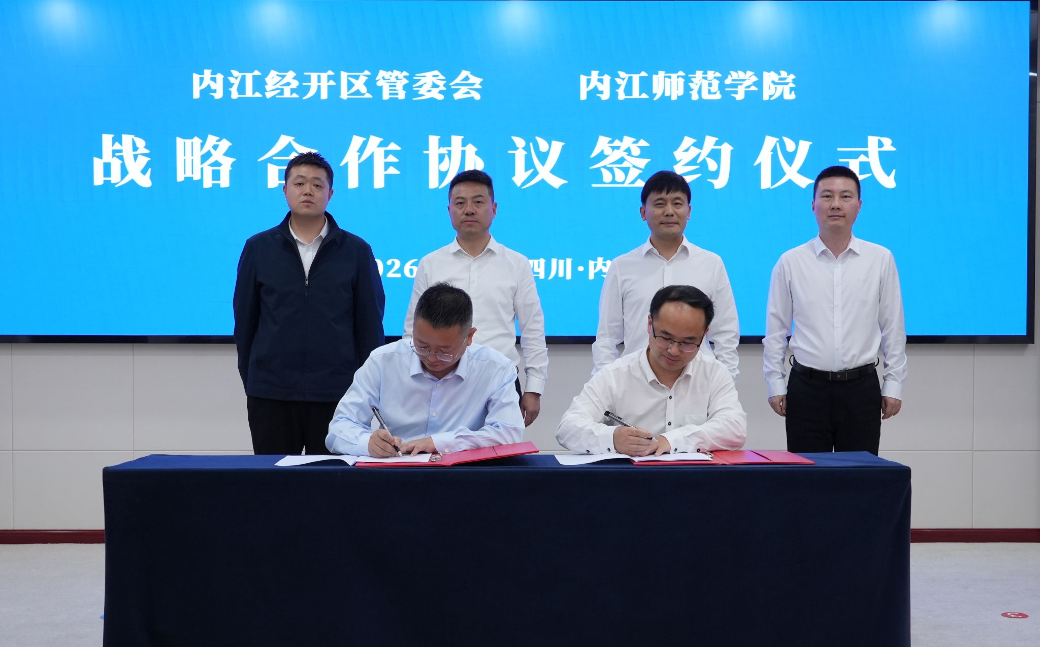 2026年4月10日下午,学校与内江经开区管委会举行战略合作协议签约仪式。学校党委副书记、校长郭云东,党委常委、副校长张志勇,经开区管委会党工委副书记、管委会主任赵钊,副主任孟晓慧、罗世锋等双方代表出席。仪式由经开区管委会副主任梁洪源主持。